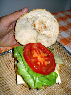 While the meat was cooking I've cut the buns in 2 an put them on the grill to. I washes the lettuce, the tomatoes and pealed the onions. I didn't use mayo because that is just extra fat, I used only mustard and a bit of ketchup and some chili. My burger looked like this: